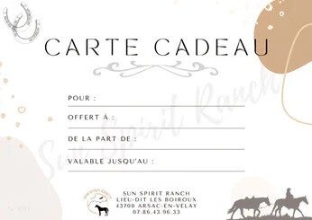 À la recherche du cadeau parfait ? Le bon cadeau Sun Spirit Ranch est une invitation à l'aventure et à la découverte du monde fascinant des chevaux. Une expérience inoubliable vous attend. Joignez-nous dans cette aventure équestre unique.